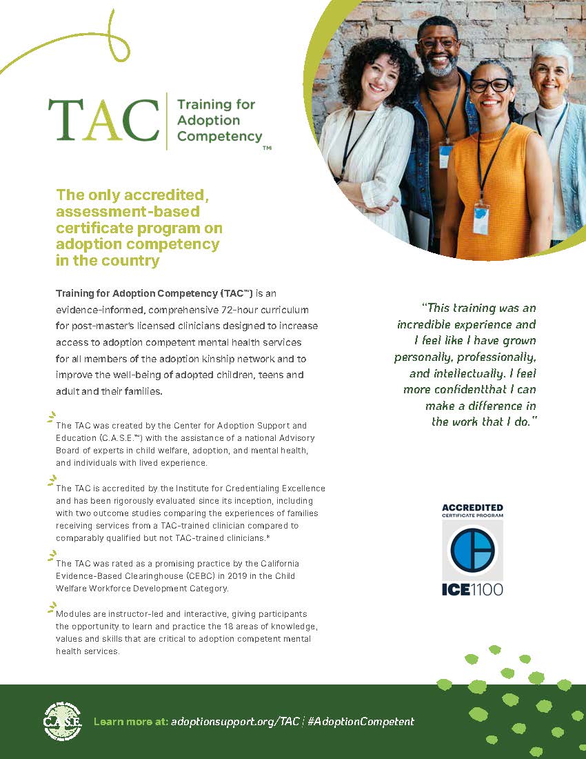 The Training for Adoption Competency (TAC™) is an evidence-informed, comprehensive 72-hour curriculum for post-master’s licensed clinicians designed to increase access to adoption competent mental health services for all members of the adoption kinship network and to improve the well-being of adopted children, teens and adult and their families.