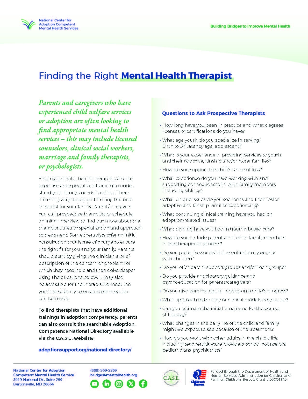 Parents and caregivers involved with child welfare services or adoption often seek appropriate mental health services, such as licensed counselors, clinical social workers, marriage and family therapists, or psychologists. Finding a therapist with expertise and specialized training to meet their family’s specific needs is crucial. Methods to find the right therapist include calling prospective therapists, scheduling initial interviews, and asking about their specialization and treatment approach. Some therapists offer free initial consultations to ensure compatibility. It’s recommended that parents provide a brief overview of their concerns and ask specific questions to determine the therapist’s suitability. Meeting the therapist in person may also help establish a connection with the youth and family involved.